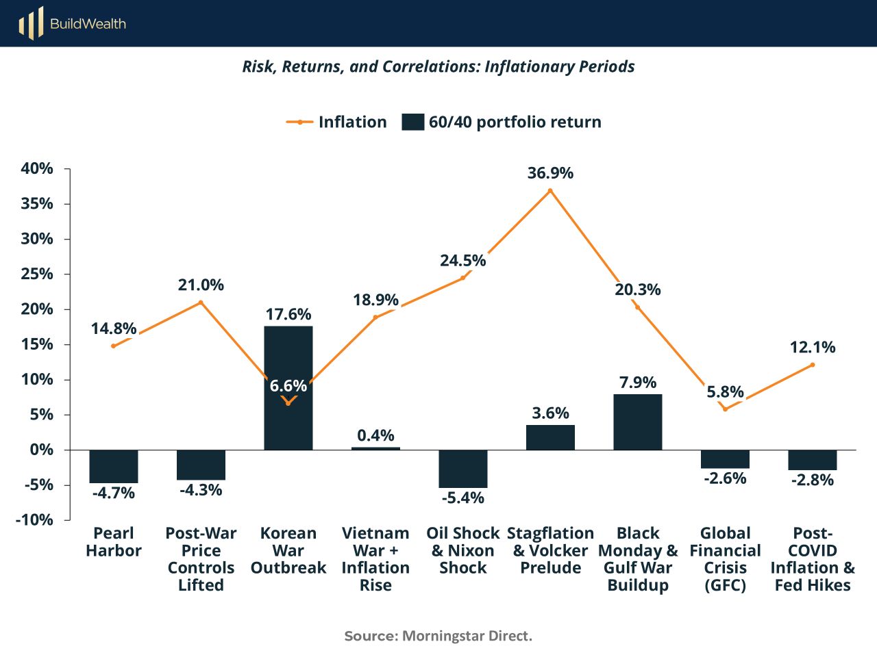 In nearly every inflationary period shown below, the 60/40 portfolio underperformed, highlighting how traditional diversification often fails when inflation, war, or regime shifts take hold.